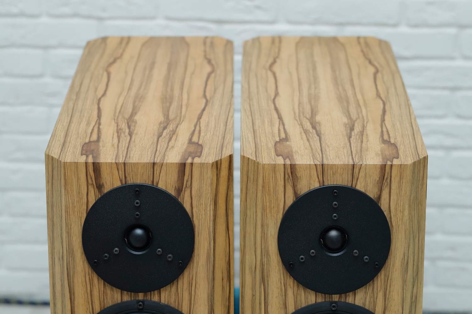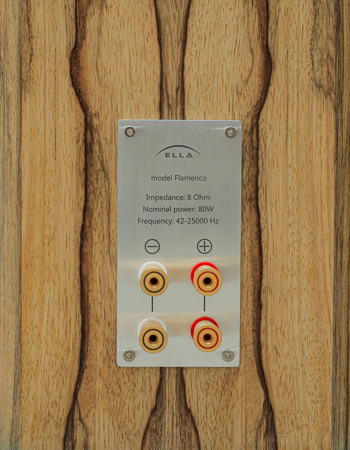 Отделка корпуса выполнена натуральным шпоном дикой офры. Шпон покрыт тремя слоями шелковисто-матового итальянского лака.